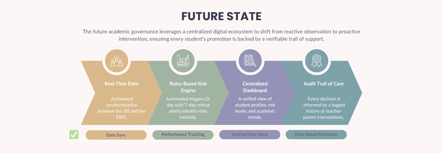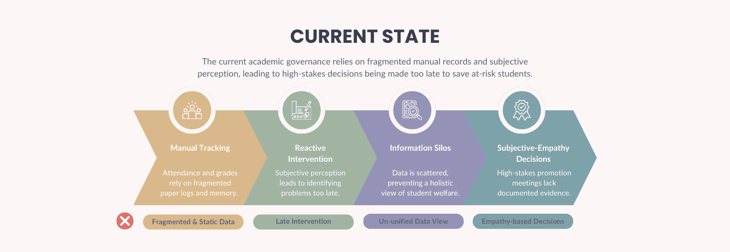 The gap was the lack of unified logic to trigger action. Data existed, but it was scattered—no mechanism connected the dots or alerted teachers before it was too late.