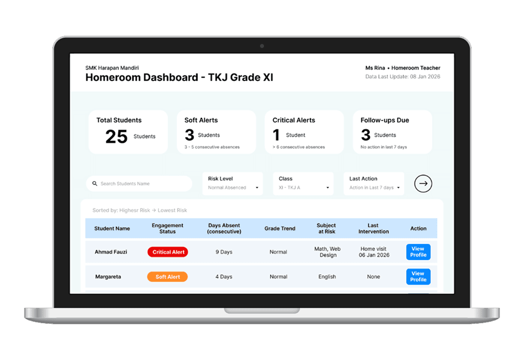 As a result, risk is usually detected too late — often during promotion meetings, when it is already difficult to intervene meaningfully. And on the meeting, homeroom teachers are expected to act as early-warning sensors for student disengagement — yet they are given no tools to see risk patterns in real time.